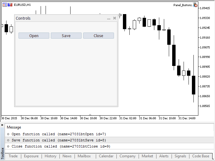 Agora podemos escrever o programa usando o painel de controle CControlsDialog, no qual são criados 3 botões "Open", "Save" e "Close". Ao pressionar o botão, é chamada a função correspondente que está escrita como um ponteiro para a função TAction.