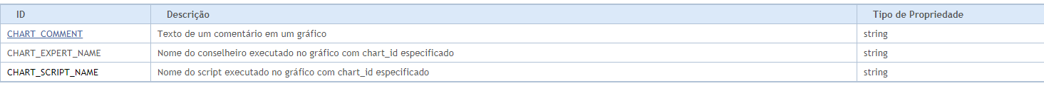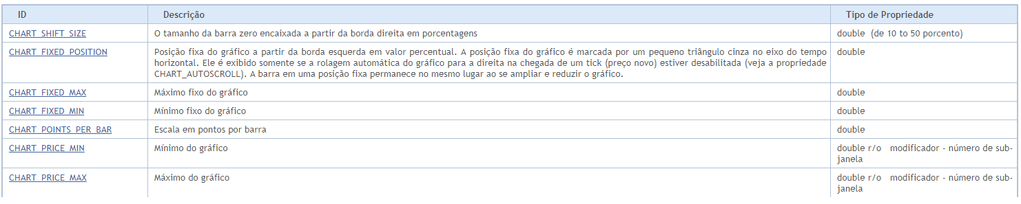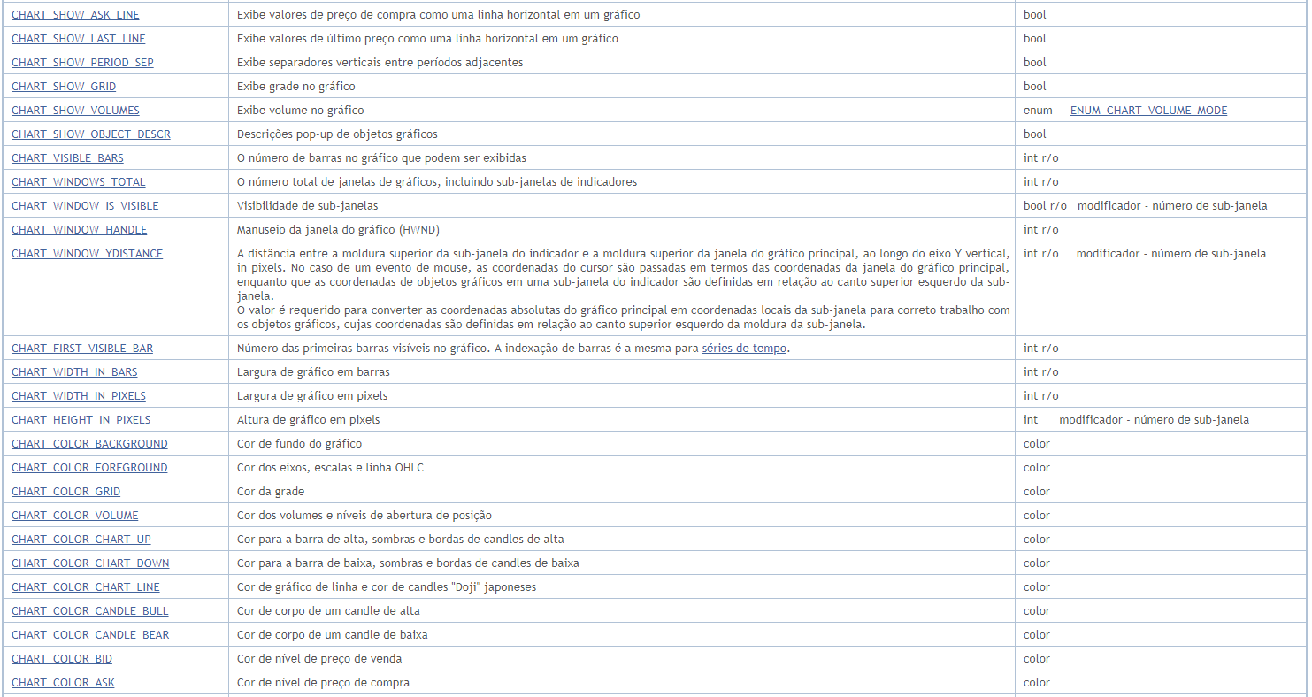 Identificadores de enumeradores ENUM_CHART_PROPERTY são usados como parâmetros de funções para trabalhar com gráficos. A abreviatura de r/o na coluna "Tipo de Propriedade" significa que esta propriedade é somente de leitura e não pode ser alterada. A abreviatura w/o na coluna "Tipo de Propriedade" significa que esta propriedade é somente leitura e não pode ser recebida. Ao acessar certas propriedades, é necessário especificar um parâmetro adicional, que serve para indicar o número da sub-janela do gráfico. 0 significa a janela principal.