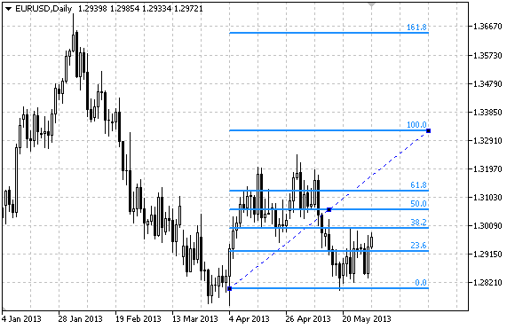 Para "Retração Fibonacci", é possível determinar o modo da continuação da sua exibição para a direita e/ou à esquerda (de acordo com a propriedade OBJPROP_RAY_RIGHT e OBJPROP_RAY_LEFT).