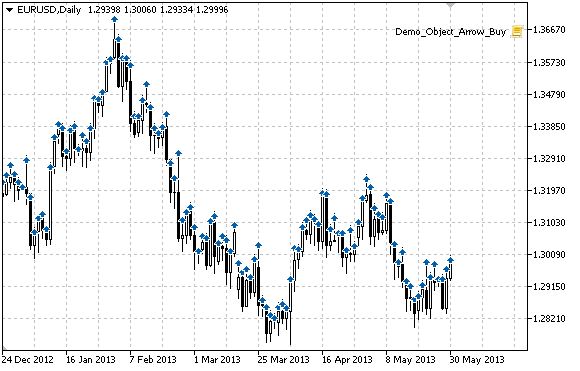 O seguinte script cria e move o sinal Buy no gráfico. Funções especiais têm sido desenvolvidas para criar e alterar as propriedades do objeto gráfico. Você pode utilizar estas funções "as is" em seus próprios aplicativos.