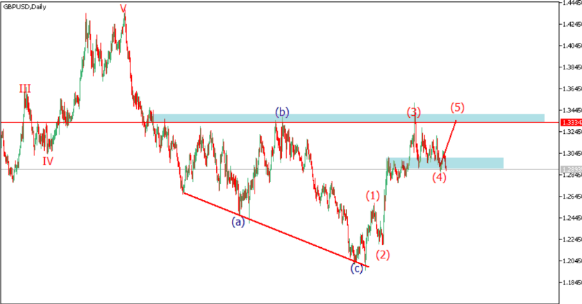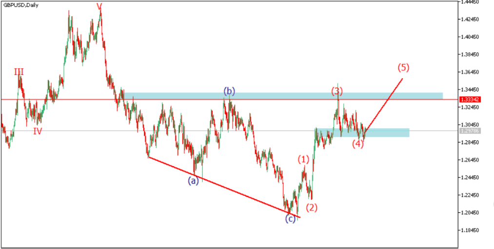 O cabo continua a mover para o lado inferior, mas ainda está acima do nível 1.28450. Enquanto o preço permanecer acima do nível 1.28450, estamos aguardando uma possível rejeição para escolher uma possível ordem de compra de longo prazo em direção a 1.33342. A alta antecipada dos preços em alta é a continuação da onda impulsiva (5) e deve ultrapassar 1,33342 em direção a 1,42450. Essa visualização só pode ser invalidada se o preço quebrar abaixo de 1,28450, se for esse o caso, é esperado um momento para a parte inferior.