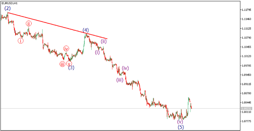 Depois que a onda impulsiva (v) e (5) saltou do nível 1.07775 e está atualmente indo para o lado superior, esperamos que o atual rali de alta de preços seja o desenrolar de uma contagem corretiva de ondas e poderia ver a quebra de preço acima de 1.08780 . Uma quebra acima desse nível empurrará o preço para o lado superior e deverá ultrapassar 1,0915 em direção a 1,09785. Essa visualização só pode ser invalidada se o preço quebrar e fechar abaixo de 1.07775, se for esse o caso, é esperado um momento adicional para o lado inferior.