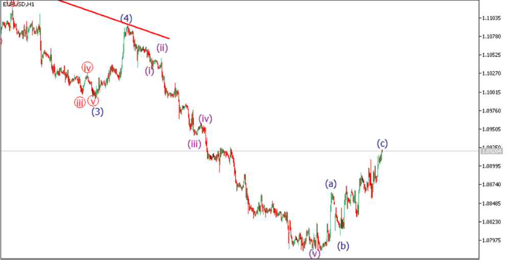 Durante o pregão anterior, o ciclo corretivo de três ondas continuou para o lado superior, com a onda impulsiva (c) estendendo-se muito mais. Como está no gráfico horário anexado, esperamos mais impulso para o lado superior e devemos quebrar acima de 1.10015. Uma quebra acima desse nível levará o preço muito mais alto para 1.11035. Essa visualização só pode ser invalidada se o preço quebrar abaixo de 1.08940, se for esse o caso, é provável que ocorram um declínio possível para 1.07975.