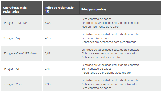 A TIM Live passou por uma redução de 20,23% na comparação anual. A Vivo teve aumento de 16,82%, enquanto houve queda de 3,82% na Oi. As pequenas prestadoras tiveram uma alta considerável de 92,01% nos protocolos.