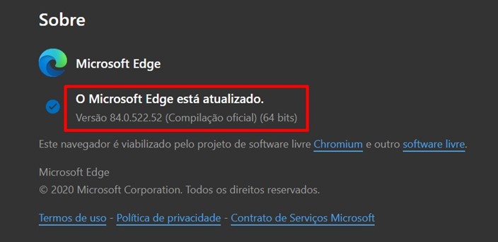 Para evitar esse e outros bugs, a empresa recomenda que os usuários mantenham o Edge sempre atualizado. Neste momento, a versão mais atual do navegador é a 84.0.522.52, que é mostrada na imagem acima. Você pode conferir a versão do Edge visitando o endereço edge://settings/help.