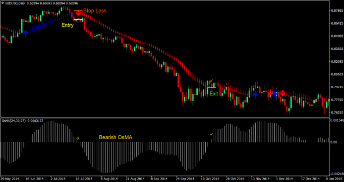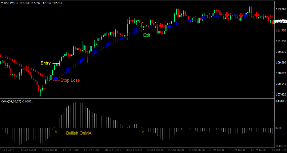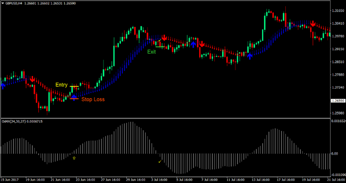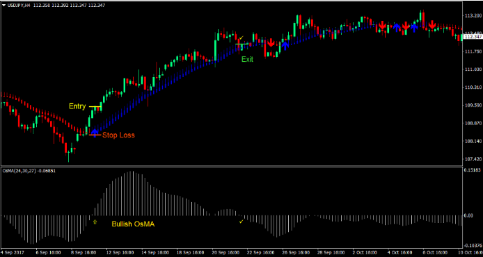Para negociar esta estratégia, as entradas devem ser feitas quando o OsMA passa de positivo para negativo ou vice-versa. O sinal de entrada do OsMA também deve coincidir com a impressão das setas e mudança das cores do Forex MT4 Trend Indicator. Esses dois indicadores tendem a estar em confluência sempre que a tendência já está mudando claramente. Ao adotar esses tipos de configurações de negociação, temos uma negociação de alta probabilidade, que também pode gerar retornos elevados.