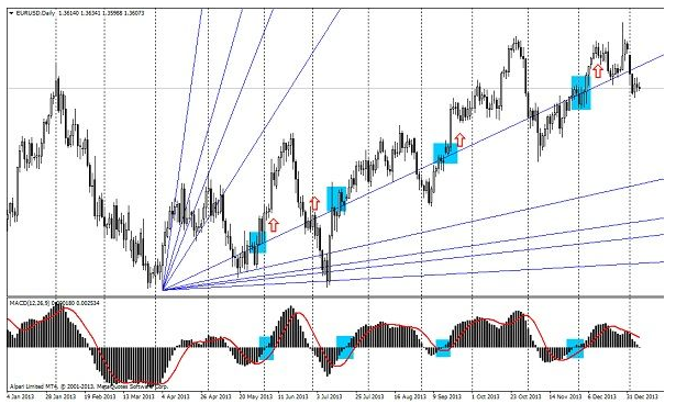 A imagem acima ilustra o leque Gann. As linhas médias baseadas em dois pontos determinam a direção da tendência. E outra linha, que está acima e abaixo da linha central, é o nível de suporte e resistência. Mas esta imagem dá um exemplo de um ventilador Gann que usa o indicador MACD, que dá um sinal adicional. Os pedidos devem ser abertos quando a linha Gann encontra a linha central ou se afasta dela significativamente.