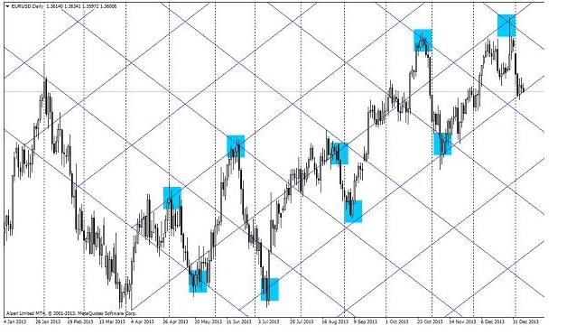 O indicador Gann mt4 inclui um instrumento de análise denominado rede Gann. O gráfico é construído em dois pontos, ainda mais, a linha central pode formar o ângulo necessário ou localização retangular corrigida de acordo com o gráfico. A rede Gann determina a distância dos preços do nível para os comerciantes abrirem as ordens. Deve-se notar que o princípio básico encontrado por William é o ângulo de 45 graus. Este ângulo deve ser formado pela linha reta principal. E se o preço bi-top for calculado, isso significa uma tendência de alta. Se o valor do preço estiver acima, a tendência é subir. Além desses dois mecanismos de análise, o indicador Gann também inclui a linha Gann. Essa linha também mostra a natureza das tendências. Mas a imagem abaixo mostra a situação quando uma linha adicional (qualquer linha) também é usada