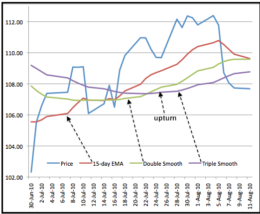A tabela e o gráfico abaixo fornecem exemplos para a MME de 15 dias, EMA com suavização dupla e MME com suavização tripla. Observe como cada MME atrasa um pouco mais o preço. Embora as médias móveis exponenciais dêem mais peso aos dados recentes, elas ainda contêm dados anteriores que produzem um atraso. Esse atraso aumenta a cada suavização.