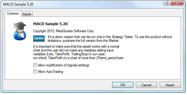 Isso abrirá a janela Propriedades do Expert Advisor. Clique em OK para iniciar os Expert Advisors no gráfico. Se um Expert Advisor foi iniciado com sucesso, seu nome e ícone aparecem no canto superior direito do gráfico.