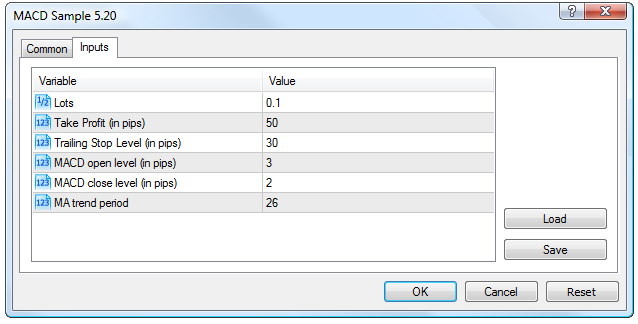 Você pode usar o botão "Salvar" para salvar o conjunto atual de parâmetros e o botão "Carregar" para carregar um conjunto salvo anteriormente. Os conjuntos de parâmetros de entrada são armazenados na pasta / Presets da plataforma de negociação.