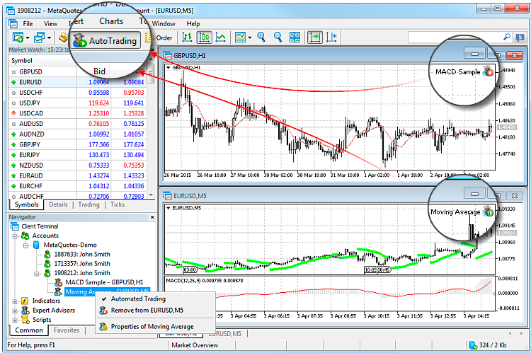 Para iniciar um Expert Advisor, anexe-o a um gráfico. A maneira mais fácil é clicar duas vezes em um Expert Advisor na janela Navigator ou arrastá-lo e soltá-lo em um gráfico.