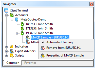 O menu de contexto contém comandos para habilitar ou desabilitar a negociação automatizada para qualquer um dos Expert Advisors, bem como para visualizar suas propriedades ou removê-las do gráfico.