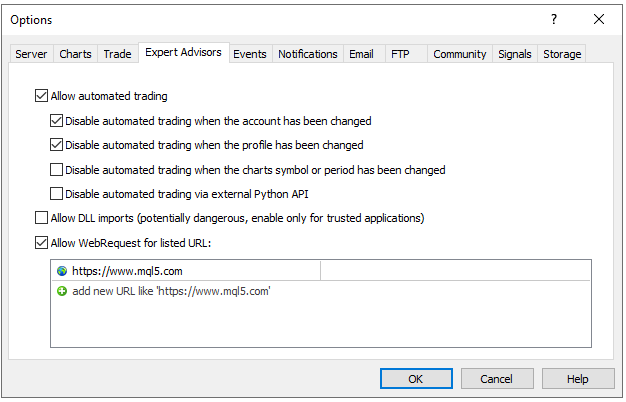 • Permitir WebRequest para URL listado - a função WebRequest () em MQL5 é usada para receber e enviar informações para sites usando solicitações GET e POST. Para permitir que um aplicativo MQL5 envie tais solicitações, habilite esta opção e manualmente especifique explicitamente os URLs de sites confiáveis. Por motivos de segurança, a opção é desabilitada por padrão.