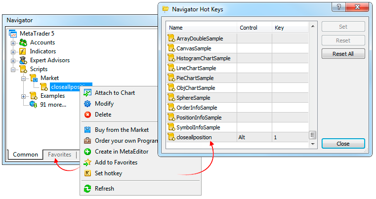 Para um início rápido em um gráfico, qualquer programa pode receber um atalho de tecla. Isso pode ser feito por meio do menu de contexto da janela do Navegador.
