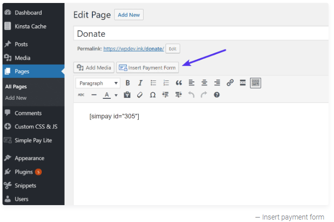 Você pode inserir um botão de pagamento em qualquer página ou postar em seu site WordPress. Basta clicar no botão “Inserir Formulário de Pagamento” no editor.
