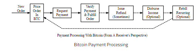 A figura acima ilustra o processamento de pagamento usando Bitcoin da perspectiva de um receptor, começando com um novo pedido. Cada uma das subseções a seguir abordará as três etapas comuns e as três etapas ocasionais ou opcionais.