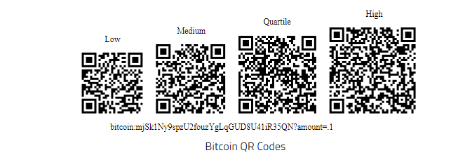 A correção de erros é combinada com uma soma de verificação para garantir que o código Bitcoin QR não seja decodificado com sucesso com dados ausentes ou alterados acidentalmente, então seus aplicativos devem escolher o nível apropriado de correção de erros com base no espaço que você tem disponível para exibir o código. A correção de danos de baixo nível funciona bem quando o espaço é limitado, e a correção de danos de nível quartil ajuda a garantir uma varredura rápida quando exibida em telas de alta resolução.