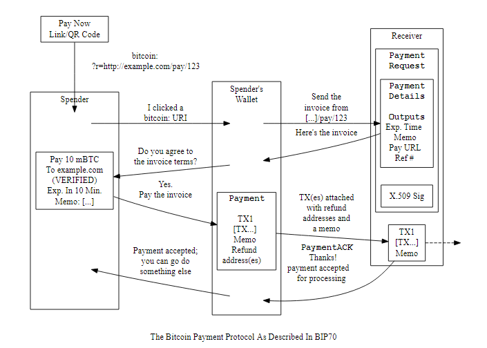 O protocolo de pagamento é descrito em detalhes no BIP70, BIP71 e BIP72. Um programa CGI de exemplo e uma descrição de todos os parâmetros que podem ser usados no protocolo de pagamento são fornecidos na subseção Protocolo de pagamento de exemplos de desenvolvedor. Nesta subseção, descreveremos brevemente em formato de história como o protocolo de pagamento é normalmente usado.
