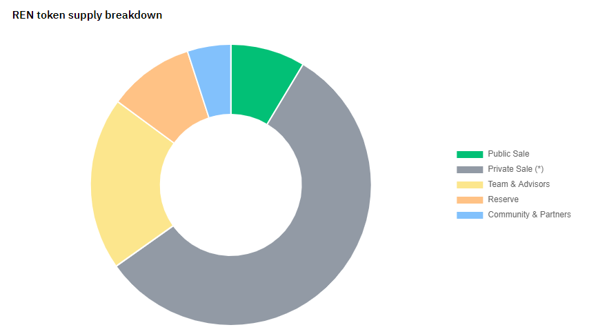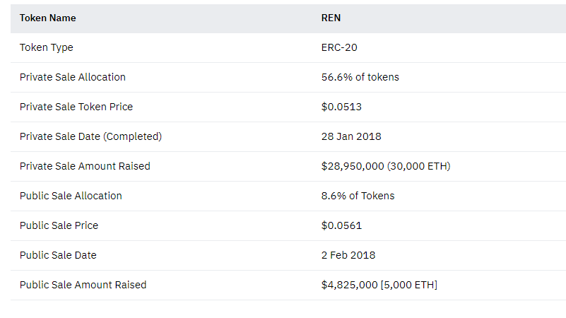 • Venda privada: foi realizada em 28 de janeiro de 2018 por 565.988.000 REN a uma taxa de 18.025 REN = 1 ETH e levantou um total de 30.000 ETH (~ $ 28.950.000) a ~ $ 0,0513 por token, vendendo 56,6% do fornecimento total de token.