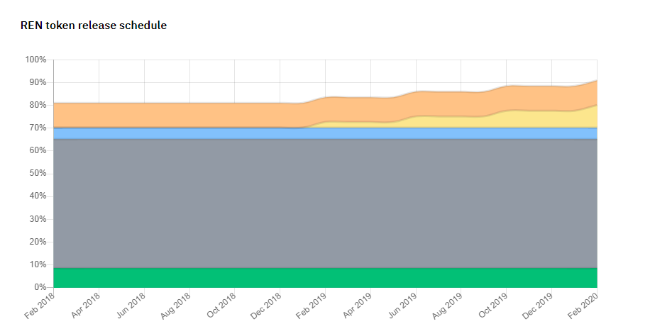 O gráfico abaixo representa o número e o detalhamento de todos os tokens REN que são e serão lançados em circulação mensalmente de fevereiro de 2018 (venda privada) a fevereiro de 2020, momento em que 91% de todos os tokens REN estarão em circulação.