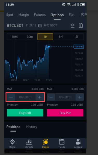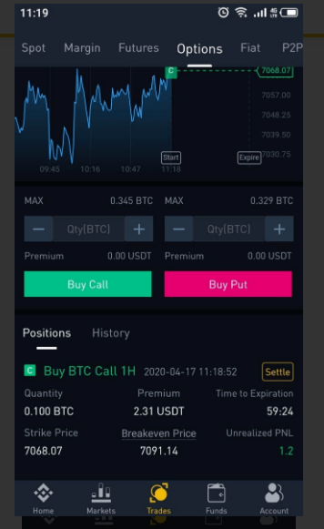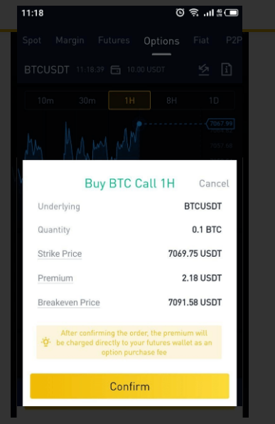 Então, o que está acontecendo aqui? Estamos comprando uma opção de compra de 1 hora para BTCUSDT com uma quantidade de 0,1 BTC ao preço de 7.069,75. O prêmio de 2,18 USDT será deduzido de nossa carteira de Futuros. Se o preço do Bitcoin subir para 7091,58, atingiremos o ponto de equilíbrio.