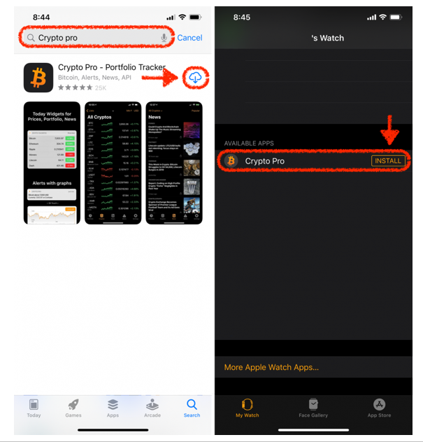 Vá para a app store e pesquise “Crypto Pro”. Toque em nosso aplicativo e instale-o. Se você tiver a instalação automática do Apple Watch habilitada, o Crypto Pro será adicionado automaticamente ao seu Apple Watch. Se não estiver, toque no aplicativo Apple Watch, role para baixo até a seção “Disponível para instalar” e toque em Crypto Pro.
