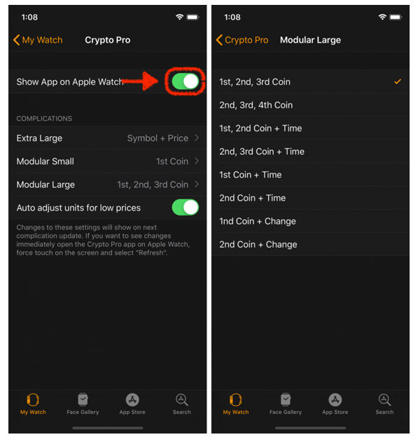 Abra o aplicativo Apple Watch em seu telefone, role para baixo e toque em Crypto Pro. Certifique-se de que “Mostrar aplicativo no Apple Watch” esteja habilitado ”.