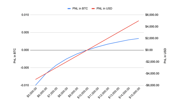 Conforme mostrado, cada incremento de $ 1000 no preço do Bitcoin não se traduz em uma quantidade proporcional de lucros ou perdas denominados em BTC. Na verdade, cada incremento subsequente no par BTC / USD retorna quantidades decrescentes de BTC. Esse fenômeno é frequentemente descrito como a natureza não linear dos contratos de futuros inversos.