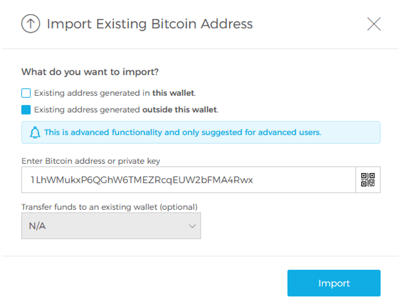 Blockchain (anteriormente Blockchain.info) é um serviço de exploração de blockchain e um provedor de carteira de criptomoedas online. Usando este serviço, você pode criar rapidamente uma carteira BTC. Se você já é titular de uma conta, faça login na sua carteira e vá para configurações >> carteiras e endereços, onde você encontrará duas seções, a saber, "Carteiras Bitcoin" e "Endereços Bitcoin importados". Para adicionar um novo endereço apenas para relógio, clique em Importar endereço Bitcoin e escolha “Endereço existente gerado fora desta carteira”. Lembre-se de que o endereço gerado fora da sua carteira blockchain não possui chaves privadas até que você as importe.
