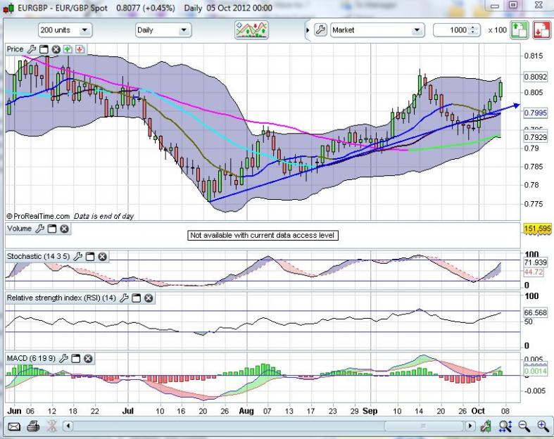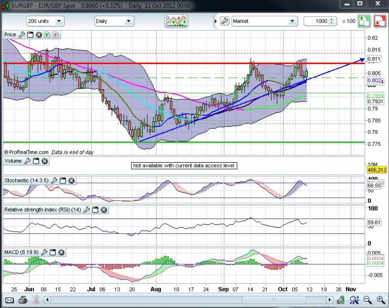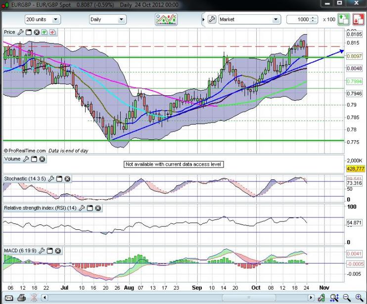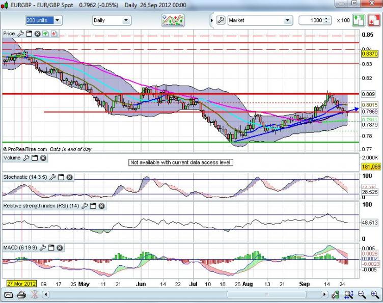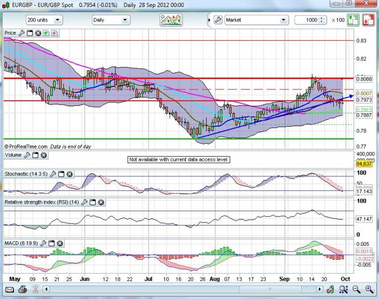 Entre 23 de Julho e 17 de Setembro o par EUR/GBP tem vindo a fazer uma subida interessante tendo tocado na resistência nos 0,8071, retrocedendo logo no imediato e levando o par a quebrar a médida Móvel de 12 dias, que é a linha azul em subida. Hoje a cotação do par chega a tocar na linha de tendência ascendente, rejeteitando preços abaixo da mesma. Nos próximos dias a quebra desta linha será a prova que a queda não chegou ao fim levando o par para a zona entre os 0,7907 e a zona dos 0,787. A reacçaõ em alta levará então a um novo teste na resistência na zona dos 0,8092.
