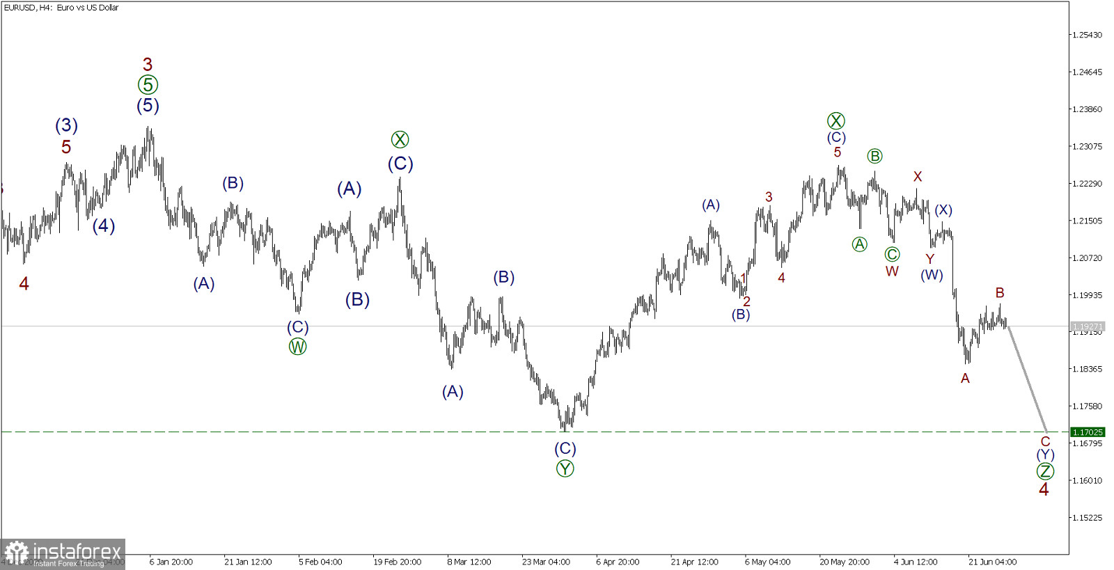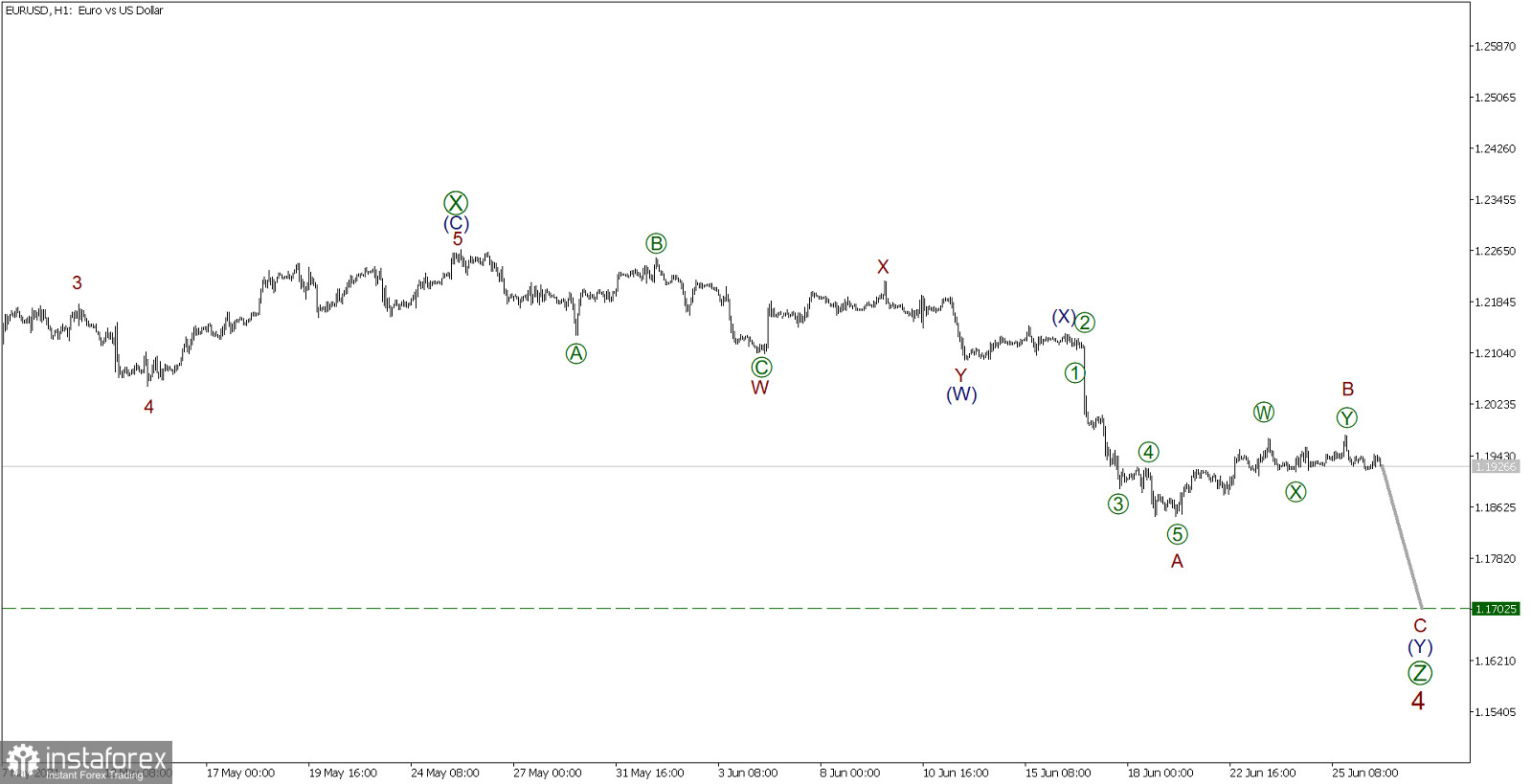 Assim, vemos a continuação da formação de uma correção profunda 4 na forma de um zigue-zague triplo. A última parte deste zigue-zague triplo - a subonda - ainda está em processo de desenvolvimento. Sua estrutura é semelhante à combinação dupla (W) - (X) - (Y). A onda (W), que assumiu a forma de um duplo zigue-zague, e o feixe de ondas (X) estão totalmente concluídos. Atualmente, vemos a formação da onda de atuação final (Y). A onda (Y) tem mais probabilidade de assumir a forma de um zigue-zague simples A-B-C. Parece que a onda B corretiva ascendente chegou ao fim.