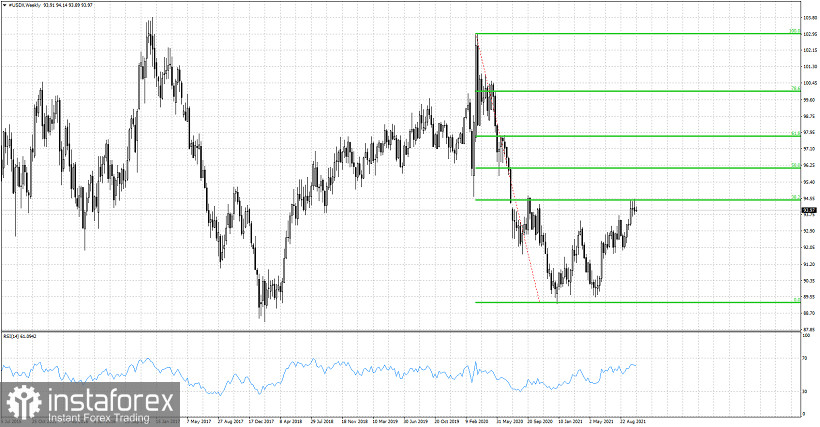 O índice do dólar permanece em uma tendência de alta a curto prazo, mas uma rejeição nos níveis atuais pode fazer com que o preço de volte para 91,70-92. Se os touros conseguirem quebrar acima da resistência em 94,50, devemos esperar que o índice continue em direção ao próximo alvo de 96,15. Com EUR / USD o principal componente do índice do dólar, tendo fornecido um sinal de reversão de alta e com potencial para subir, o índice do dólar muito provavelmente será rejeitado no nível de Fibonacci de 38%. Os touros do dólar precisam ser muito cautelosos.