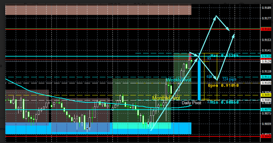 USD/CHF está sendo negociado a 0,9131 e acima do nível de abertura de 0,9105