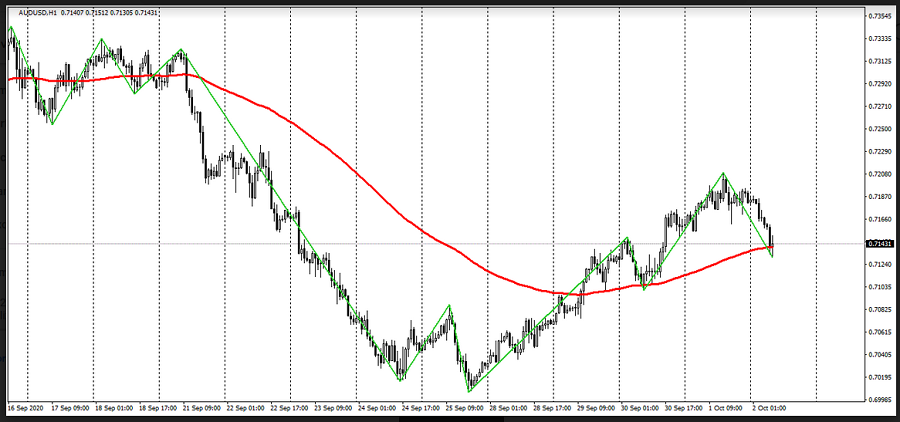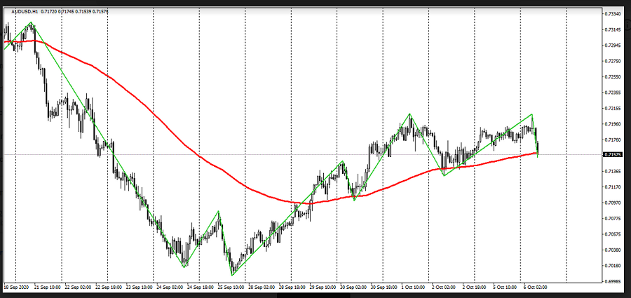O par dólar australiano / dólar americano está sendo negociado em tendência de alta. De acordo com o intervalo 1H, os pontos extremos estão aumentando, enquanto a média móvel de 120 dias está abaixo do preço. Isso indica a força dos compradores. O indicador em zigue-zague também mostra a estrutura ascendente do par conforme as mínimas e máximas estão subindo.