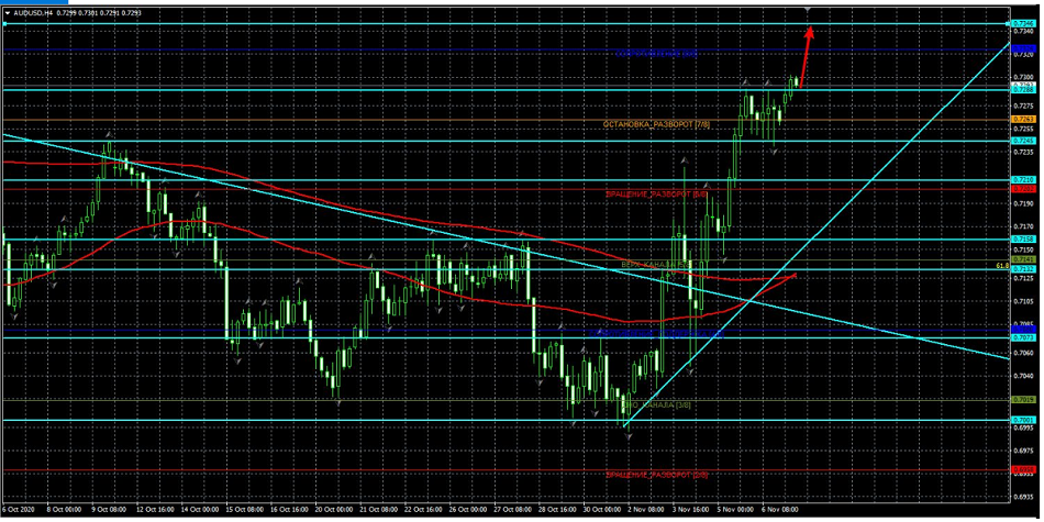 Em geral, o par voltou ao mercado em alta no gráfico diário. Se não fosse pela incerteza do mercado em meio à eleição dos EUA, o par teria testado a alta anual de 0,7414 nas próximas 48 horas. No entanto, tudo pode acontecer agora, dada a situação atual. Tecnicamente, a tendência de alta ainda está em vigor com o par sendo negociado acima da linha 4/8 de Murrey (no 4H), bem como acima das médias móveis da МА 55 e МА 200.