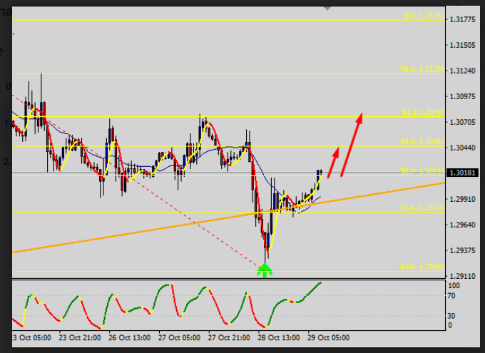 De acordo com os níveis de Fibonacci, o preço já está na marca dos 50,0. O nível de 1,29144 atua como um alvo, pois o preço começou a subir a partir dessa marca. Posteriormente, este nível servirá como resistência.