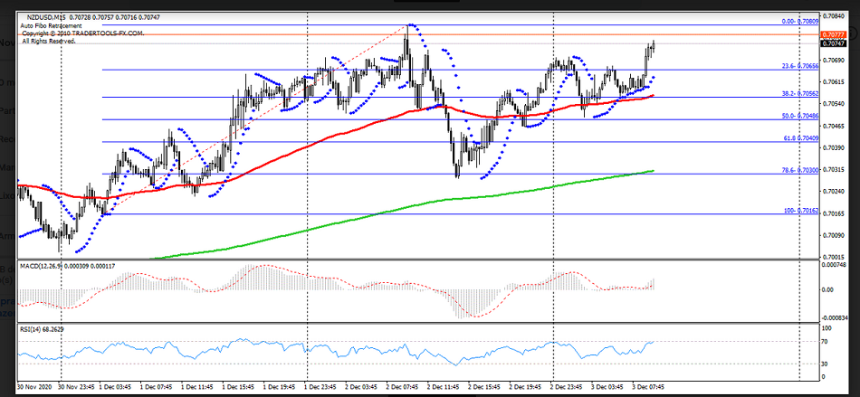 Hoje, a melhor maneira de obter lucro é comprar o par NZ / USD, já que o indicador de média móvel está abaixo do preço atual no gráfico 1H. É possível considerar os níveis de 0,7060 e 0,7030. Uma ordem take profit pode ser colocada em 0,7090, enquanto uma ordem stop loss pode ser definida em nível 0,7010. O indicador MACD na tabela horária também aponta para a tendência de alta do par, uma vez que está na zona de sobrevenda. Para confirmar o sinal, vamos dar uma olhada no gráfico M15.