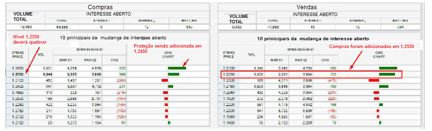 Quanto às mudanças opcionais: analisando os dez níveis de preços com as maiores mudanças em volumes, podemos distinguir o nível 1.2450, onde a adição máxima de opções de compra ocorreu. Uma boa resistência estará possivelmente perto dessa faixa. No nível de 1.2350, foram adicionadas 505 ordens de vendas. Com base na situação técnica no gráfico, o nível pode ser quebrado pelos compradores. Se você abrir uma ordem de compra a partir deste nível, então o nível de lucro obtido será apenas um acúmulo máximo de opções de compra. Mover grandes volumes de opções de compra superiores ao nível de preços pode indicar a expectativa de grandes traders de um novo crescimento.
