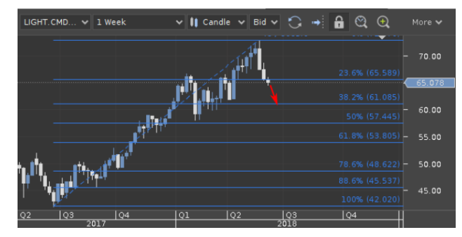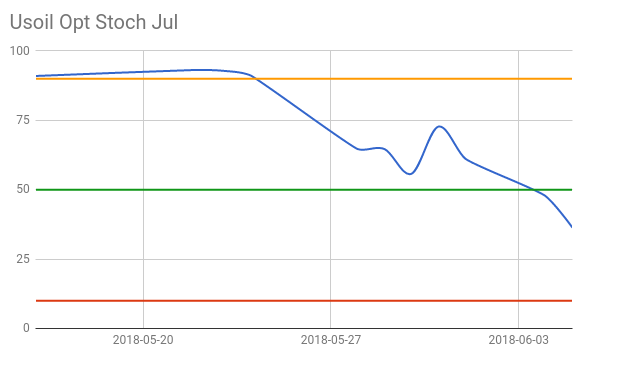 Vamos começar pelos mercados de commodities, principalmente com o petróleo bruto. Aqui nós testemunhamos uma reversão rápida. Abaixo está o gráfico dos futuros do WTI com entrega em julho.