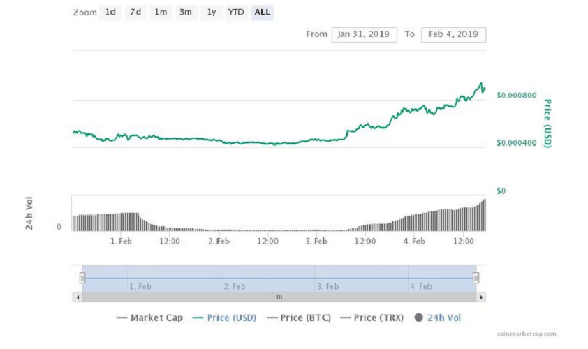 O preço do token BitTorrent (BTT) subiu mais de 600% desde sua oferta inicial de moedas (ICO) - esgotada em minutos - de acordo com os dados da CoinMarketCap desta última segunda-feira, 4 de fevereiro.