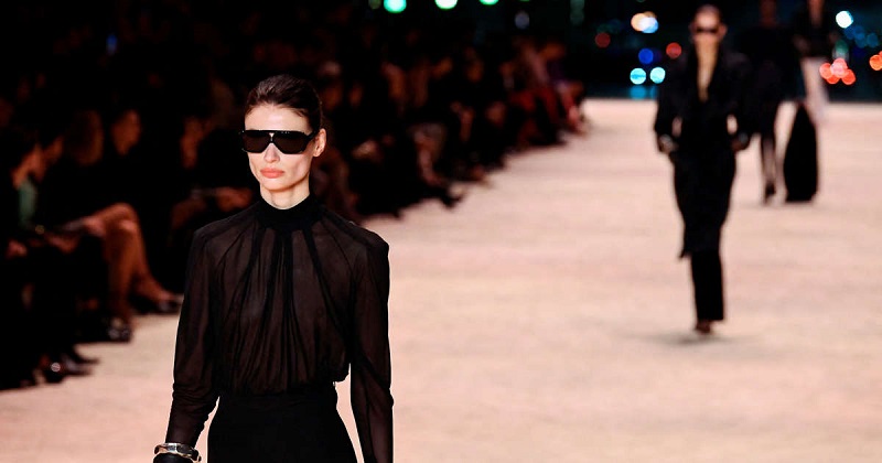 A casa de moda francesa Yves Saint Laurent realizou uma apresentação noturna na passarela da Paris Fashion Week na terça-feira, exibindo uma série de vestidos de festa finos de uma passarela com vista para a base da Torre Eiffel.