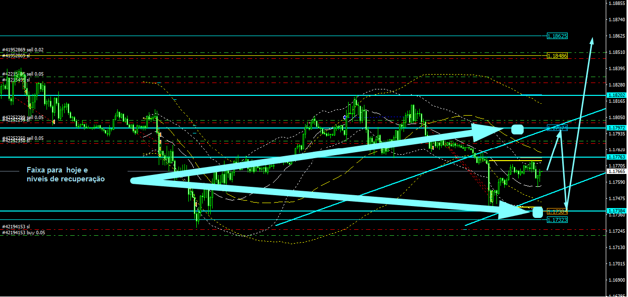 Agora vamos avaliar o que temos para a negociação intradiária. De acordo com o gráfico do período de 15 minutos, a linha de tendência aponta para o norte. Os níveis alvo são 1,1830 e 1,1860. Posteriormente, espero que o preço seja rejeitado e recue para 1.1779. Esse é o movimento dos preços para hoje. Eu não excluo uma quebra de 1,1779, embora eu duvide disso. Então, espero que o preço suba para 1,1750 e 1,1710. Nesses níveis, estarei esperando por uma quebra e um movimento maior para 1,1910. Sim, senhoras e senhores, inserimos um intervalo de negociação em que o par vai negociar em zigue-zague. O mais importante aqui é identificar os movimentos para cima e para baixo. Enquanto isso, o preço é superior a 1.1779, indo para o norte.