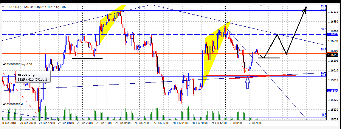 Ontem, tudo foi trabalhado surpreendentemente bem, a cunha foi quebrada, e então eles cairam para 1.1600. Próximo de 1.1600, decidi comprar um pouco. Por algum tempo eles ficaram próximos de 1600, e depois no gráfico horário, depois de formar um pequeno modelo de absorção da alta, subiram, ultrapassando a linha inclinada ao longo da qual nos movíamos ontem.