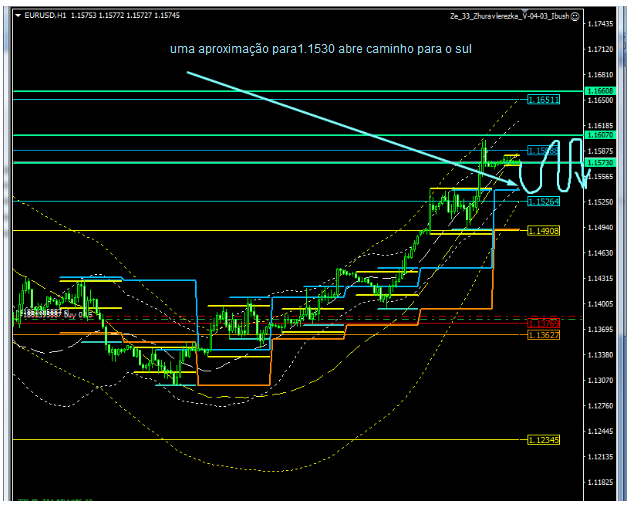 Os níveis confirmando as direções dentro do dia, o topo é 1,1540, o fundo é 1,1491, no momento, estamos no nível superior, pode haver uma nuance quando estamos acima do nível, isso significa que as confirmações foram recebidas, vamos supor, para o norte, e o sinal foi para o sul, em tais momentos, simplesmente começamos a pular para cima e para baixo e não vamos a lugar nenhum, geralmente tento trabalhar por ordens curtas, pois os caminhos são limitados em ambas as direções.