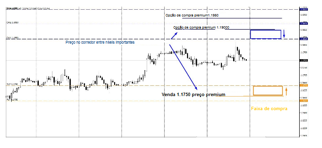 Por meio do indicador da Faixa Esperada, podemos reconhecer os níveis de opções importantes em que o maior número de contratos foi aberto por dia. Para contrato de futuros, esses níveis são 1.1950 e 1.1900 (opções de compra) e 1.1750 (opções de venda). Deduzimos um prêmio de risco e um ponto a termo. Os valores, que temos, devem ser plotados no gráfico. Assim, temos os níveis a ter em conta quando procuramos os pontos de entrada no mercado.