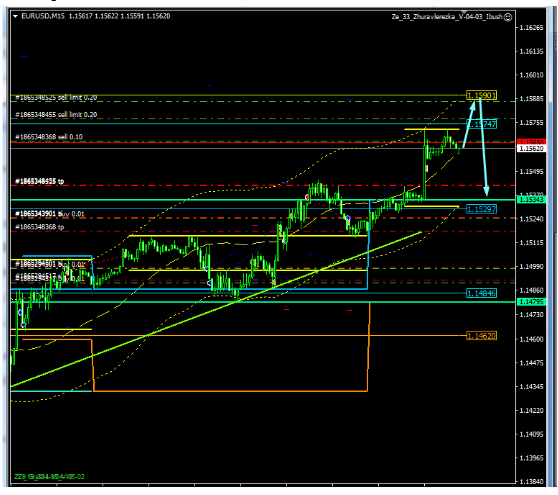 Eu tenho duas opções para obter o sinal do sul, o primeiro está no nível de 1.1587, onde vou adicionar uma venda, o segundo é aguardar o sinal no M15.