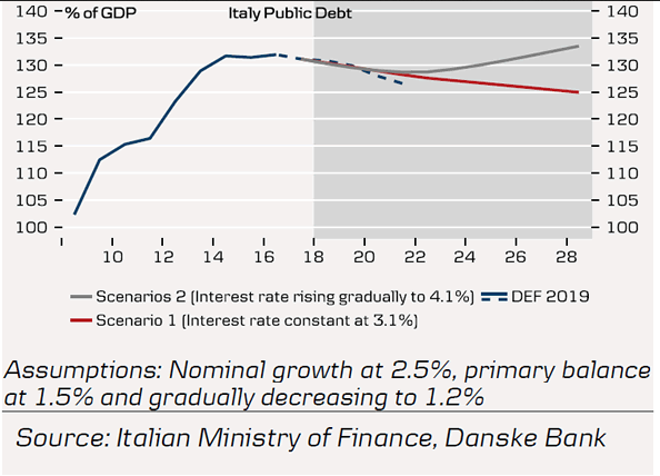 A reação do mercado e o desenvolvimento das receitas italianas obrigarão o governo a revisar sua estratégia fiscal e determinar a probabilidade de uma futura crise da dívida italiana. O rendimento dos títulos do governo italiano, assim como os spreads dos títulos alemães, estão no nível mais alto desde 2014. Apesar do crescimento esperado no déficit orçamentário, o plano orçamentário do governo ainda prevê um superávit primário de 1,3–2,1% em 2019-2021. Isso é importante para prever as obrigações da dívida, já que as taxas de juros médias da dívida pública na Itália ainda excedem o crescimento nominal do PIB (um efeito negativo de bola) e, portanto, o superávit primário deve compensar o crescimento desfavorável da taxa de juros. Enquanto o governo for capaz de sustentar o superávit orçamentário primário em cerca de 1,5%, a dívida nacional estará sob controle, mesmo que o crescimento desacelere para 0,9% e os custos de empréstimos cresçam moderadamente nos próximos anos.
