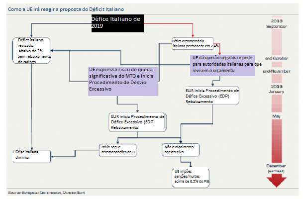 O maior risco é que a política fiscal ditada por Bruxelas provoque uma reação populista dos eurocéticos. No entanto, podemos ver que a probabilidade de saída real da Itália da UE no futuro é baixa, principalmente devido às difíceis consequências econômicas e financeiras, e um longo processo constitucional ao deixar a UE.