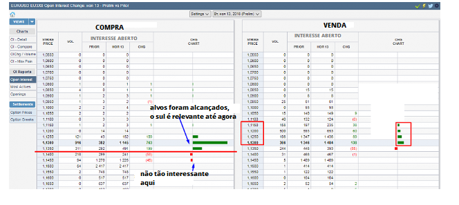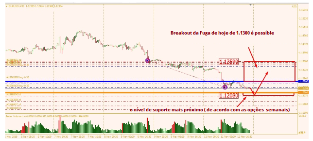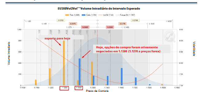 Mesmo se considerarmos a situação para hoje, no contrato semanal, o maior volume de venda foi de 1,1250 a preços futuros / 1,1220 a preços forex.